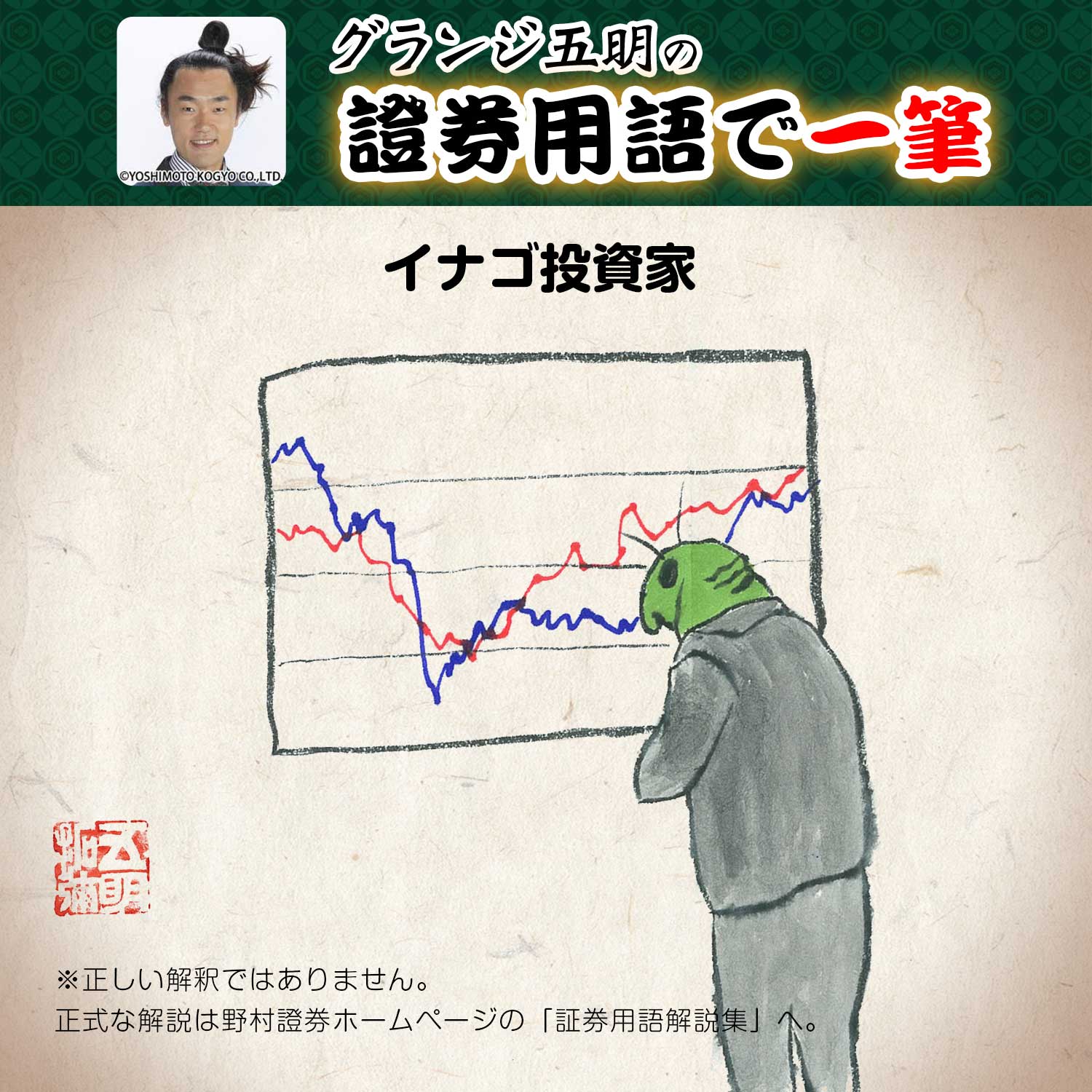 野村證券 A Twitter お笑い芸人 グランジの五明拓弥さんによる グランジ五明の證券用語で一筆 をお届け 今回のお題は010 イナゴ投資家 です 顔がイナゴ似の投資家 似というよりモロイナゴ 気持ちが悪い Kabu