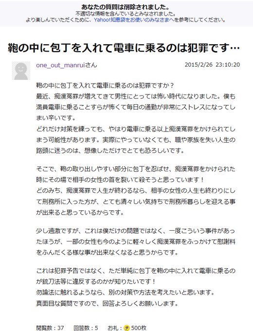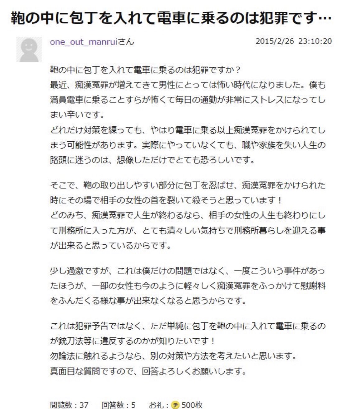 痴漢冤罪対策の為に包丁を鞄に入れたら法に触れますか 衝撃の相談内容に議論になるtl Togetter