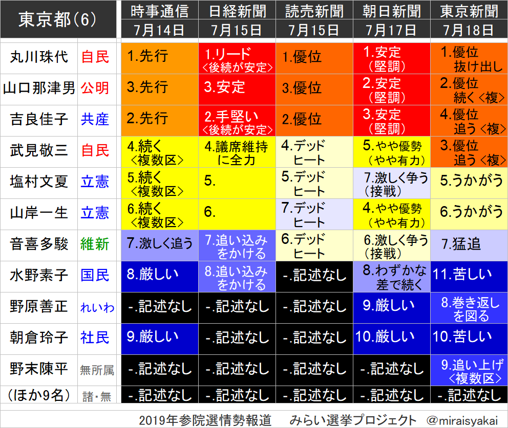 2019年参院選 序盤情勢 東京選挙区の各マスコミ情勢予想まとめ2 7月6日 7日調査の最新版 パテントマスター 宮寺達也のブログ
