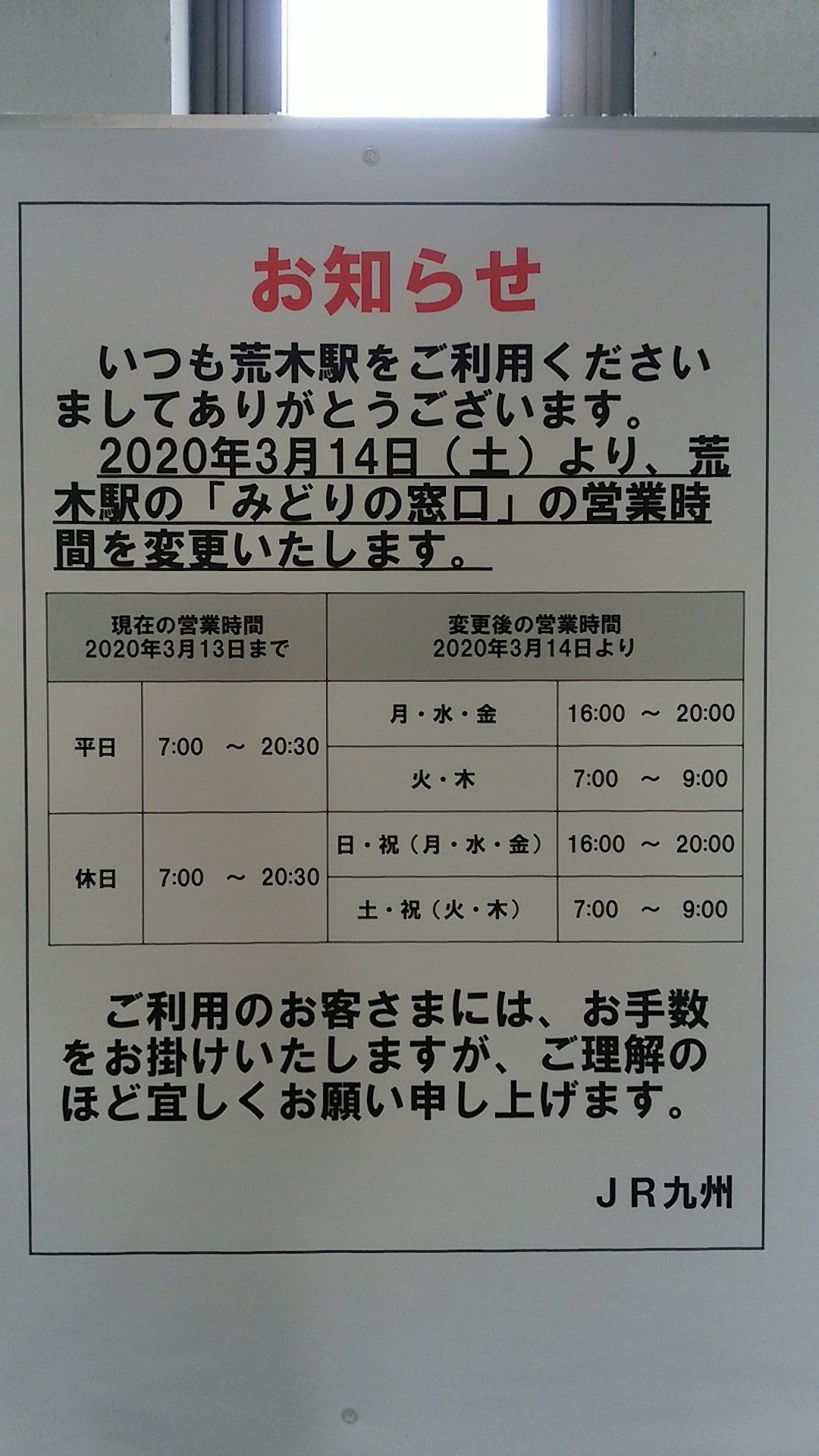 うちこ On Twitter 荒木駅みどりの窓口 ダイヤ改正から営業時間短縮です 窓口閉鎖時間は事実上の無人駅となるのか 改札業務のみ行うのかは不明です